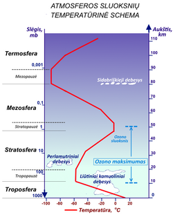 • Stratosfera – žemutiniame jos sluoksnyje temperatūra pastovi, nuo 25 km pradeda kilti ir iki stratopauzės pasiekia 0 °C. 20-25 km aukštyje yra didžiausia ozono koncentracija.