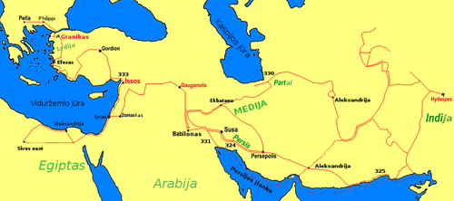 331 metais Gaugamelų mūšyje sutriuškino persų kariuomenę, užėmė Babiloną, užkariavo Persiją. Užimtuose kraštuose Aleksandras diegė graikų kultūrą, perėmė dalį vietinių papročių, steigė įtvirtintas gyvenvietes, valdyti patikėjo vietiniams kitataučiams.