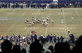 Kiekvieno žaidimo epizodo pradžioje abi komandos išsirikiuoja viena prieš kitą, išilgai linijos, ant kurios stovi kamuolys. Centrinis žaidėjas, laikydamas kamuolį tarp kojų, perduoda jį už jo stovinčiam savo komandos įžaidėjui (angl. quarterback).