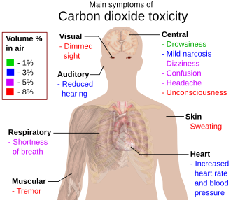 Pagrindiniai simptomai apsinuodijus anglies dioksidu.