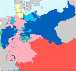 Padėtis po karo: Prūsijos teritorijos pažymėtos tamsiai mėlynai, prisijungtos teritorijos - žydrai, jos sąjungininkų - mėlynai, Austrijos - raudonai, jos sąjungininkų - šviesiai raudonai