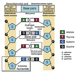 Deoksiribonukleorūgštis susideda iš deoksiribonukleotidų. Deoksiribonukleotidas yra sudarytas iš heterociklinės azoto bazės ir angliavandenio deoksiribozės. Deoksinukleotidai skiriasi azoto bazėmis. Pagrindinės yra keturios: adeninas (A), guaninas (G), citozinas (C) ir timinas (T).