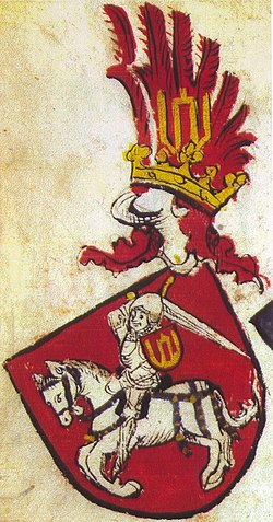 Vytis su Gedimino stulpais riterio herbe, priskiriamam Žygimantui Kęstutaičiui, Codex Bergshammar, 1440