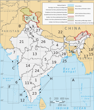 Indija yra federacinė respublika, administraciškai suskirstyta į 28 valstijas ir 8 sąjungines teritorijas. Valstijos savo ruožtu padalintos į rajonus.