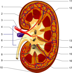 Inksto pjūvis: 1 – piramidės, 2-tarpskiltinė arterija, 3 – inksto arterija, 4 – inksto vena, 5 – inksto vartai, 6 – inksto geldelė, 7 – šlapimtakis, 8 – mažosios taurelės, 9 – inksto kapsulė, 10 – apatinis galas, 11 -viršutinis galas, 12 – tarpskiltinė vena, 13 – nefronas, 14 – inksto antis, 15 – didžiosios taurelės, 16 – inksto (piramidės) speneliai, 17 – inksto šulai