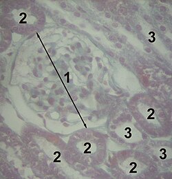 Histologinė nefrono sandara: 1-inksto kūnelis (matosi kapsulė ir glomerulas, 2-artimasis vingiuotasis kanalėlis, 3-tolimasis vingiuotasis kanalėlis