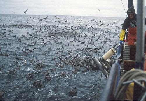 Kita vertus, paukščiams žvejybos pramonė neretai naudinga, nes jie sulesa žvejų išmestas žuvis ir jų vidurius. Pavyzdžiui, tokiu būdu gaunamas maistas sudaro apie 30 procentų Šiaurės jūros paukščių raciono, o kai kurių populiacijų siekia iki 70 procentų. Šiaurinio fulmaro (Fulmarus glacialis) paplitimas Didžiojoje Britanijoje aiškinamas kaip tik tuo, kad aplinkinėse jūrose labai išvystyta žvejybos pramonė. Naudos iš žvejybos atliekų daugiausiai turi tie paukščiai, kurie maistą renka nuo vandens paviršiaus, o povandeniniams medžiotojams, tokiems kaip pingvinai, tai gali būti žalinga.