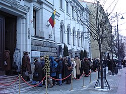 Laukiantys eilėje pagerbti Lietuvos mokslų akademijoje pašarvotą poetą Justiną Marcinkevičių. Vilnius, Gedimino prospektas, 2011-02-18