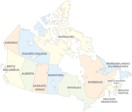 | Britų Kolumbija (Britanijos Kolumbija) | BC | Viktorija | Ramiojo vandenyno pakrantė arba Vakarų pakrantė |