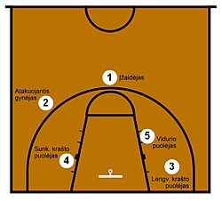 Rungtynėse komandą sudaro 12 protokole registruotų žaidėjų. Aikštėje vienu metu žaidžia po 5 kiekvienos komandos žaidėjus. Jie skirstomi į pozicijas: vidurio puolėją, sunkųjį krašto puolėją, lengvąjį krašto puolėją, atakuojantį gynėją, įžaidėją. Būna nestandartinis krašto puolėjas, gynėjas.