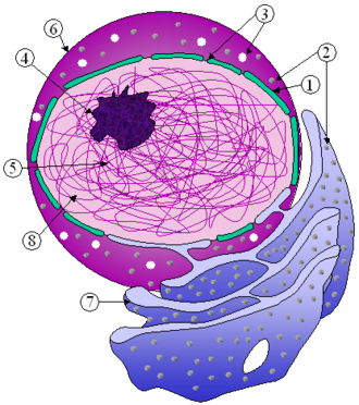 Branduolys: 1. sienelė 2. ribosomos 3. poros 4. branduolėlis 5. chromatinas 6. branduolys 7. endoplazminis tinklas 8.