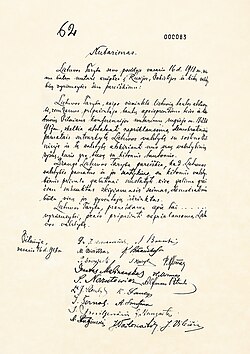 Nepriklausomybės nutarimo faksimilė (1918 m. vasario 16 d.)