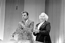 Justinas Marcinkevičius ir Meilė Lukšienė vykstant Steigiamajam Sąjūdžio suvažiavimui, 1988 m.