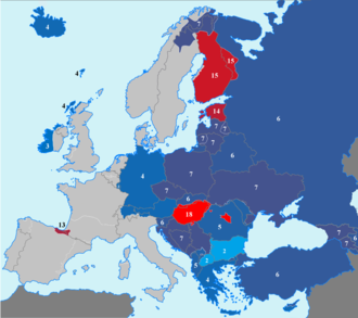 Linksnių skaičius bendrinėse Europos kalbose. Pilka spalva pažymėtos kalbos daiktavardžių nelinksniuoja.