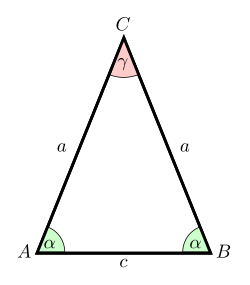 γ=180∘−2⋅α=2⋅arcsin⁡(c2⋅a)=arccos⁡(1−c22⋅a2){\displaystyle \gamma =180^{\circ }-2\cdot \alpha =2\cdot \arcsin \left({\frac {c}{2\cdot a}}\right)=\arccos \left(1-{\frac {c^{2}}{2\cdot a^{2}}}\right)}{\displaystyle \gamma =180^{\circ }-2\cdot \alpha =2\cdot \arcsin \left({\frac {c}{2\cdot a}}\right)=\arccos \left(1-{\frac {c^{2}}{2\cdot a^{2}}}\right)}