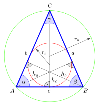 Apie trikampį apibrėžto apskritimo spindulys ru=a2⋅sin⁡(α)=b2⋅sin⁡(β)=c2⋅sin⁡(γ)=a24⋅a2−c2{\displaystyle r_{u}={\frac {a}{2\cdot \sin(\alpha )}}={\frac {b}{2\cdot \sin(\beta )}}={\frac {c}{2\cdot \sin(\gamma )}}={\frac {a^{2}}{\sqrt {4\cdot a^{2}-c^{2}}}}}{\displaystyle r_{u}={\frac {a}{2\cdot \sin(\alpha )}}={\frac {b}{2\cdot \sin(\beta )}}={\frac {c}{2\cdot \sin(\gamma )}}={\frac {a^{2}}{\sqrt {4\cdot a^{2}-c^{2}}}}}