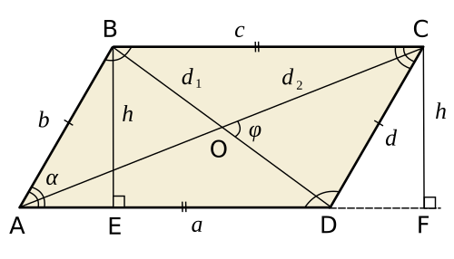 - Kaip ir kiekvieno iškiliojo keturkampio, lygiagretainio plotas yra lygus įstrižainių ir kampo tarp jų sinuso sandaugos pusei.