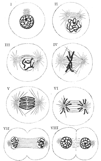 Mitozė ir jos fazės: I-III profazė, IV metafazė, V-VI anafazė, VII-VIII telofazė