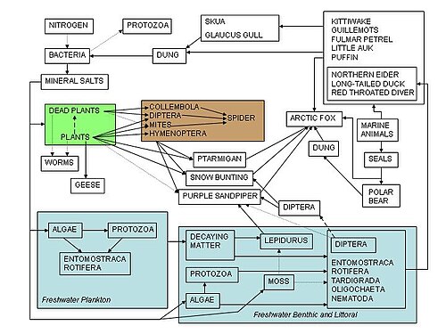 Victor Summerhayes ir Čarlzo Eltono 1923 m. publikuotas vienas anksčiausių mitybos tinklo pavyzdžių