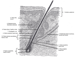 Plaukai. Plaukai, tai odos dariniai, sudaryti iš sukietėjusių epidermio ląstelių. Plauko dalys yra: plauko kūnas arba stiebas (scapus pili), šaknis (radix pili), glūdinti tikrojoje odoje esančiame plauko maišelyje, ir plauko galas (apex pili). Plaukai dengia viso kūno odą, išskyrus delnų, padų, pirštų šoninį paviršių, apyvarpės vidinės dalies, varpos galvutės ir varputės odą. Jie yra epiteliocitų kilmės. Kiekviena epidermio įmautė (invaginacija) vadinama plauko folikulu. Ją sudaro išorinė ir vidinė plauko makštys, kurias išorėje gaubia iš tikrosios odos kilęs trisluoksnis plauko maišelis. Į folikulo galą įauga epidermio ląstelėmis apsuptas tikrosios odos spenelis – plauko spenelis. Jame yra daug kraujagyslių ir juntamųjų nervinių skaidulų rezginys. Maišelyje esanti plauko dalis vadinama plauko šaknimi, virš odos esanti – plauko stiebu. Plauko šaknis, esanti arčiau spenelio, yra sustorėjusi ir vadinama plauko stormeniu. Folikulas yra plauko gyvybės ir augimo šaltinis. Plauko spenelio epiteliocitai daugindamiesi ir ragėdami suformuoja plauko šaknį ir stiebą. Spenelio viršūnės epidermio ląstelės gamina dideles, vakuolizuotas bei melanizuotas ląsteles, kurios suformuoja plauko šerdį, medulla. Tarp šerdies ląstelių yra dujų burbuliukų. Šerdį turi tik ilgi plaukai. Iš spenelio vidurinės dalies epidermocitų formuojasi labiau keratinizuotas kompaktinis sluoksnis – plauko žievė. Iš spenelio pamato epidermio ląstelių vystosi išoriausias plauko sluoksnis – plauko kutikulė. Prieš išlendant plaukui iš odos, prie jo maišelio prisitvirtina šiaušiamasis plauko raumuo dar truputį aukščiau atsiveria greta esančios riebalinės liaukos latakas.