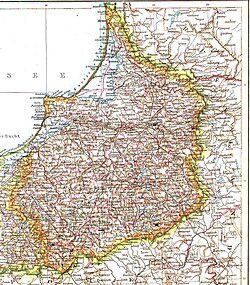 „Vokietijos kalbų žemėlapio“ 1880 m. Andrées pasaulio atlase fragmentas. Geltonai pažymėtos sritys, kuriuose dominuoja lietuvių kalba, žaliai – sritys, kuriose dominuoja lenkų kalba