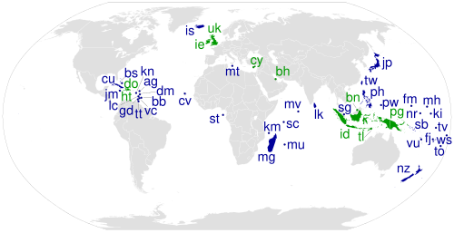 Nepriklausomos valstybės ir dalinai pripažintos valstybės, įsikūrusios salose (Australija laikoma žemynu): turinčios sausumos sienas pažymėtos žaliai, o neturinčios – mėlynai