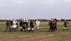 Kalavijuočiams ir jų talkininkams grįžtant, prie upės brastos jie sutiko žemaičių karius. Nenorėdami rizikuoti ir prarasti savo žirgus pelkėtoje vietovėje, kryžininkai atsisakė kovoti ne raiti ir žygio dalyviai buvo priversti pasilikti nakvynei. Kitą rytą žemaičiai, vadovaujami kunigaikščio Vykinto, puolė kalavijuočius. Manoma, kad lengvai ginkluoti kalavijuočių vadovaujami vietiniai Livonijos kariai pabėgo iš mūšio lauko, o sunkiai ginkluoti riteriai, įskaitant magistrą Folkviną, buvo išžudyti.