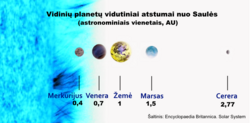 Saulės sistemos Žemės grupės planetų palyginamieji vidutiniai atstumai nuo Saulės (planetų dydžiai neproporcingi atstumams, spalvos invertuotos)