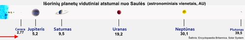 Saulės sistemos kūnų palyginamieji vidutiniai atstumai nuo Saulės (kūnų dydžiai neproporcingi atstumams, spalvos invertuotos)