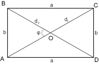 Čia d – bet kuri iš stačiakampio įstrižainių, φ – kampas tarp įstrižainių.