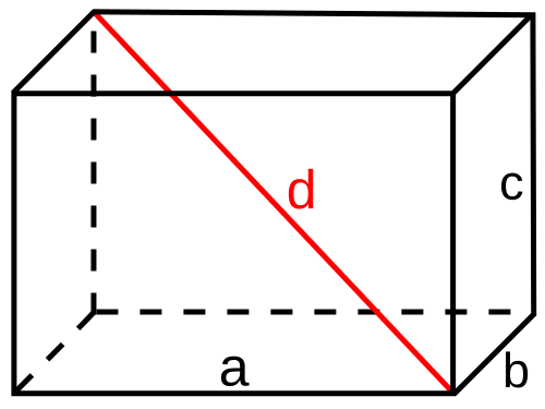 Erdvinės įstrižainės ilgis d=2⋅ru=a2+b2+c2{\displaystyle d=2\cdot r_{u}={\sqrt {a^{2}+b^{2}+c^{2}}}}{\displaystyle d=2\cdot r_{u}={\sqrt {a^{2}+b^{2}+c^{2}}}}