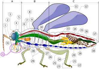 Vabzdžio kūno sandara: A. Galva, B. Krūtinė, C. Pilvelis. 1. Antena, 2. Apatinė paprastoji akelė, 3. Viršutinė paprastoji akelė, 4. Facetinė akis, 5. Galvos smegenys, 6. Priešnugarėlė, 7. Aorta (nugarinė arterija), 8. Trachėja su kvėptukais (stigmomis), 9. Vidunugarėlė, 10. Panugarėlė, 11. Antsparniai, 12. Plėviniai sparnai, 13. Malamasis skrandis, 14. Širdis, 15. Kiaušidė, 16. Plonoji, storoji ir tiesioji žarna, 17. Analinė anga, 18. Makštis, 19. Pilvo nervų grandinėlė, 20. Malpigijaus vamzdeliai, 21. Pentinas, 22. Nagai, 23. Letena, 24. Blauzda, 25. Šlaunis, 26. Klubas, 27. Gurklys, 28. Krūtinės nerviniai mazgai, 29. Dubenėlis, 30. Seilių liauka, 31. Aplinkryklinis nervinis žiedas, 32. Burna