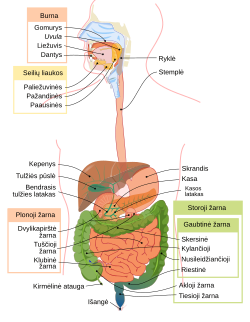 Burna - Ryklė - Stemplė - Skrandis - Kasa - Tulžies pūslė - Kepenys - Plonoji žarna - Storoji žarna - Išangė