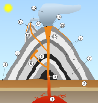 Ugnikalnio struktūra 1. Magmos židinys 2. Pamatinė uoliena 3. Stemplė 4. Papėdė 5. Silė (akloji atšaka) 6. Šoninė stemplė 7. Ugnikalnio išmestų pelenų sluoksniai 8. Šlaitas 9. Ugnikalnio išmestos lavos sluoksniai 10. Žiotys 11. Šoninis kūgis 12. Lavos srautas 13. Anga 14. Krateris 15. Pelenų debesis