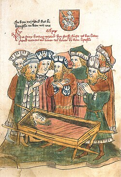 1. Pavaizduotas Ulricho fon Richentalio Konstanco susirinkimo kronikoje (vok. Chronik des Konstanzer Konzils), 1483 m.