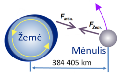 Žemė yra vienintelė Saulės sistemos planeta, turinti sąlyginai didelį palydovą − Mėnulį. Dėl masės skirtumų Žemės-Mėnulio sistemos gravitacinis centras yra Žemės viduryje. Mėnulis vidutiniškai nutolęs nuo Žemės apie 384 000 km ir apskrieja aplink Žemę maždaug per 27 paras (mėnuo). Mėnulio gravitacinė trauka Žemės paviršiuje sukelia dvi potvynio bangas: vieną arčiausioje Žemės pusėje ir kitą priešingoje. Tuo pat metu 90° kampu nutolusiame Žemės paviršiuje vyksta atoslūgiai. Dėl greito Žemės sukimosi Mėnulio sukeltas vandenynų ir sausumos išgaubtumas visuomet yra šiek tiek priekyje nei tuo atveju, jei sistema būtų stacionari. Sąveikaudamas su šiuo išgaubtumu Mėnulis po truputį tolsta nuo Žemės. Savo ruožtu Mėnulio sukelti potvyniai dėl sausumos pasipriešinimo vandens judėjimui stabdo Žemės sukimąsi aplink savo ašį. Tokiu būdu Žemės sukimąsis apie savo ašį lėtėja apie 1 sekundę kas 50 000 metų, kai Mėnulis tolsta nuo Žemės apie 38,2 milimetro kasmet. Dėl didelės tarpusavio sąveikos menkai tikėtina, kad Mėnulis kada nors pabėgs iš Žemės orbitos. Praeityje Žemės sukelti potvyniai Mėnulyje buvo kur kas didesni ir visiškai sustabdė Mėnulio savarankišką sukimąsi aplink savo ašį, dėl to Mėnulis yra nuolat atsisukęs į Žemę tik viena savo puse.