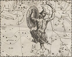 Oriono žvaigždynas Jano Hevelijaus žvaigždėlapyje (1690 m., veidrodinis atspindys)